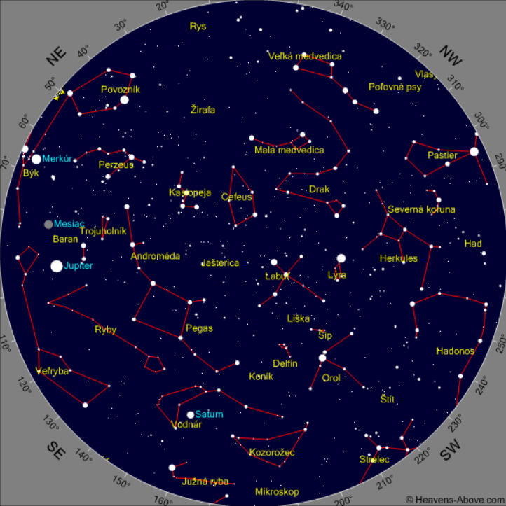 Saturn – podmienky na pozorovanie sa postupne zlepšujú. V apríli vychádza tesne pred východom Slnka, v máji už 2 hodiny pred východom Slnka a v júni po polnoci.