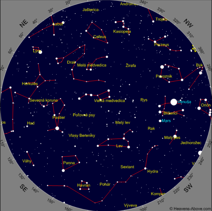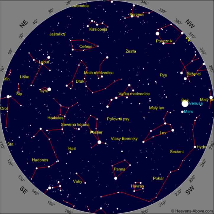 Venuša – bude veľmi nápadným objektom na večernej oblohe. V apríli a máji bude zapadať viac ako 3 hodiny po západe Slnka, koncom júna 2 hodiny po západe Slnka.