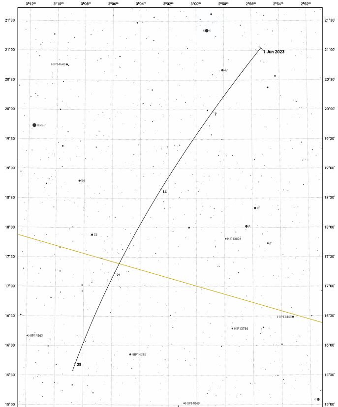 Vyhľadávacia mapka kométy C/2020 V2 (čiara s dátumami) v súhvezdí Barana. Žltá čiara znázorňuje ekliptiku.