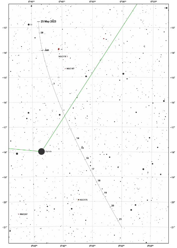Vyhľadávacia mapka kométy C/2021 T4 (čiara s dátumami) v súhvezdí Veľryby.