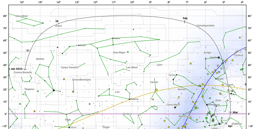 Vyhľadávacia mapka kométy C/2022 E3 (čiara s dátumami). Žltou čiarou je vyznačená ekliptika, fialovou nebeský rovník a modrou galaktický rovník.