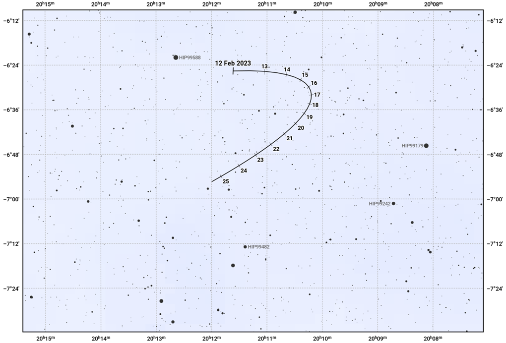 Krátkoperiodická kométa 96P/Machholz 1 bola objavená 12. mája 1986 D. Machholzom. Pri obežnej dobe 5,29 roka prejde perihéliom 31. januára 2023. Okrem malých SOHO komét je to kométa s najmenšou vzdialenosťou perihélia 0,116 au spomedzi všetkých očíslovaných krátkoperiodických komét. Od ostatných krátkoperiodických komét sa tiež líši vysokým sklonom dráhy 57,5 stupňa a veľkou excentricitou 0,962. Priemer jadra je 6,4 km. Od ostatných komét sa líši aj chemickým zložením s nízkym zastúpením uhlíka. Mohlo by to znamenať, že vznikla pri inej hviezde mimo Slnečnej sústavy. V roku 2023 bude jasnejšia ako 12m v januári a februári. Počas prechodu perihéliom môže dosiahnuť až jasnosť 2. magnitúdy, avšak uhlove bude len 6 stupňov od Slnka. Tesne pred východom Slnka by mohla byť viditeľná pár dní okolo 19. februára. Efemerida pre 0 hodín UT: