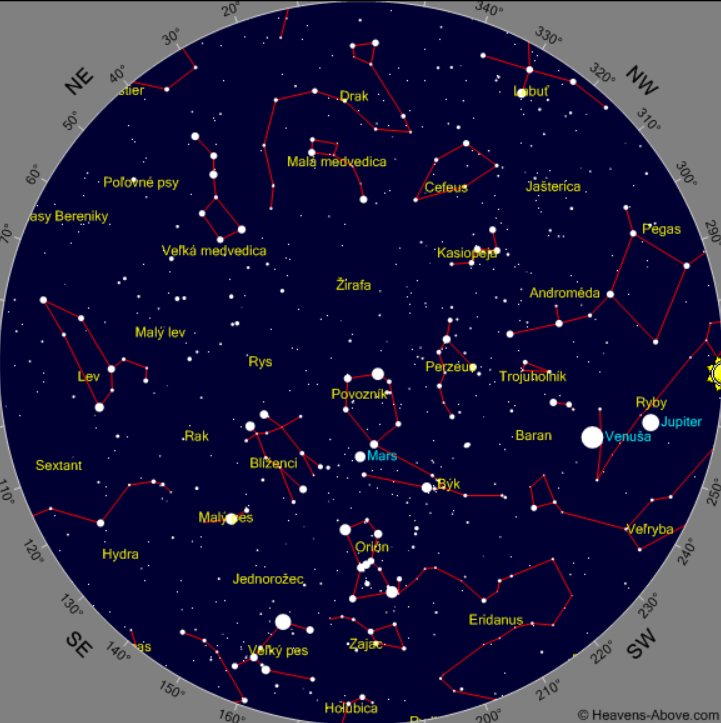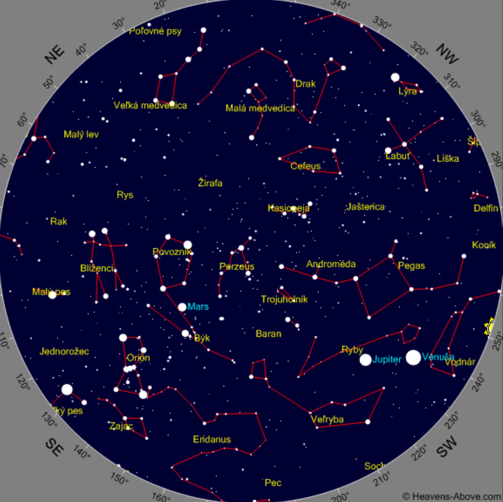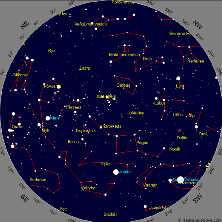 Mars – podmienky na pozorovanie sú výborné. V januári bude na oblohe takmer celú noc, zapadá ráno o 4. hodine, vo februári zapadá o 3. hodine a v marci dve hodiny po polnoci.