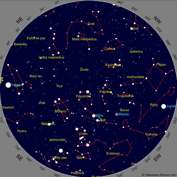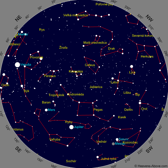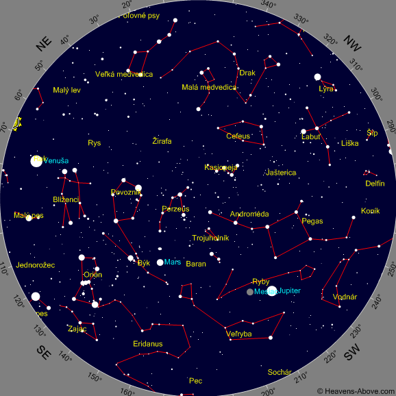 Mapky znázorňujú polohu planét na rannej a večernej oblohe pre stred príslušného mesiaca: