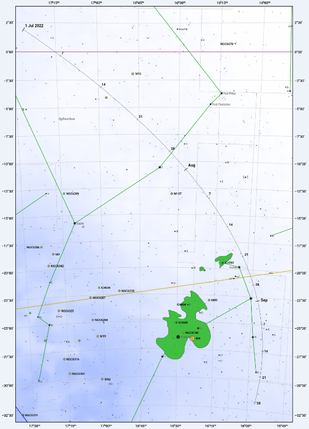 Vyhľadávacia mapka kométy C/2017 K2 PanSTARRS (čiara s dátumami) v súhvezdiach Hadonos a Škorpión. Žltou je vyznačená ekliptika a fialovou nebeský rovník.