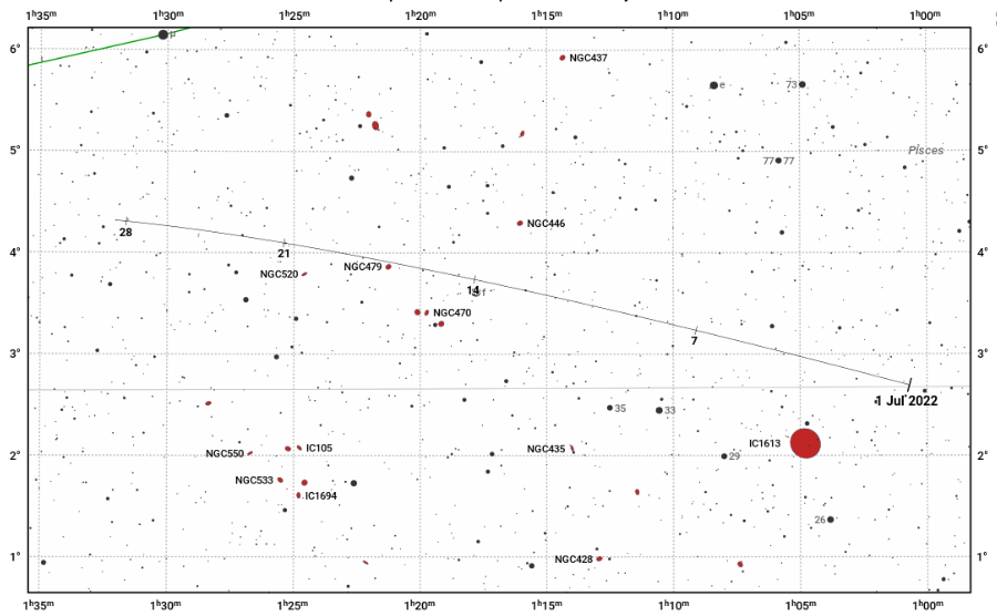Vyhľadávacia mapka kométy 22P/Kopff (čiara s dátumami) v súhvezdí Rýb.
