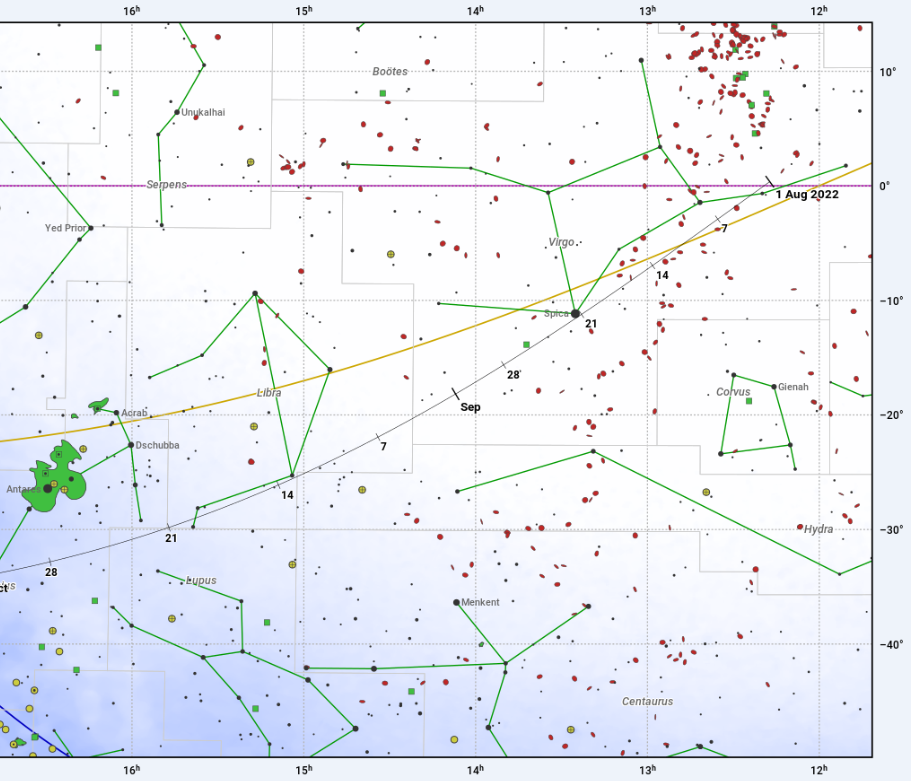 Vyhľadávacia mapka kométy 73P/ Schwassmann-Wachmann 3 (čiara s dátumami) v súhvezdiach Panna, Váhy, Vlk a Škorpión. Žltou je vyznačená ekliptika a fialovou nebeský rovník.