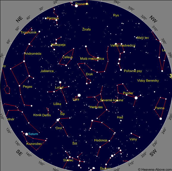 Saturn – podmienky na pozorovanie sú výborné. Začiatkom júla vychádza 1 hodinu pred polnocou, v strede augusta okolo 20. hodiny a koncom septembra, keď vychádza už pred západom Slnka je pozorovateľný od večera až do 3. hodiny ráno.