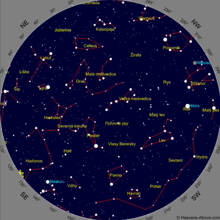 Mapky znázorňujú polohu planét na rannej a večernej oblohe pre stred príslušného mesiaca: