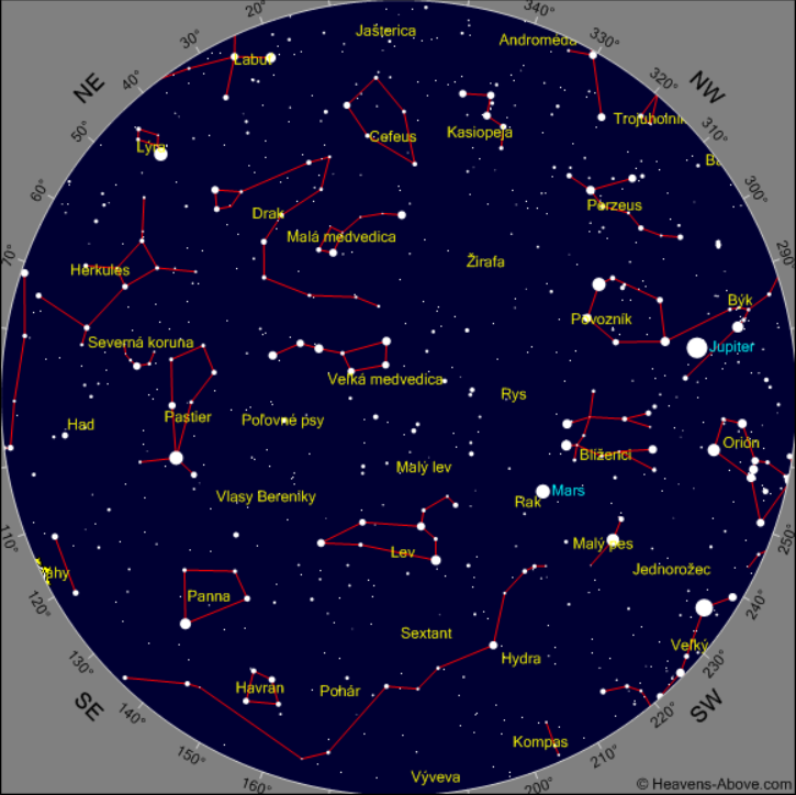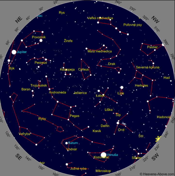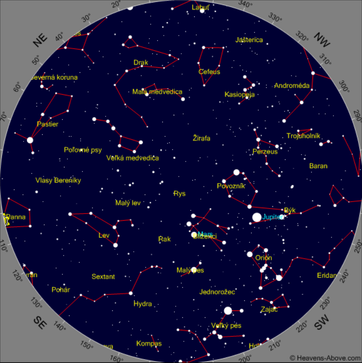 Jupiter – podmienky na pozorovanie sú výborné. V októbri bude vychádzať okolo 21. hodiny, v novembri pred 18. hodinou a v decembri bude pozorovateľný celú noc.