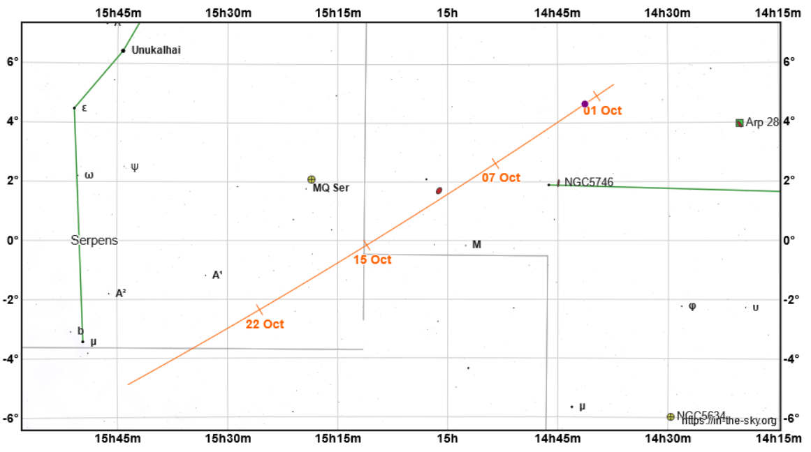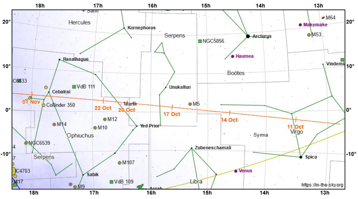Vyhľadávacia mapka kométy C/2023 A3 (oranžová čiara s dátumami) v októbri v súhvezdiach Panny, Hada a Hadonosa. Žltá čiara znázorňuje ekliptiku.
