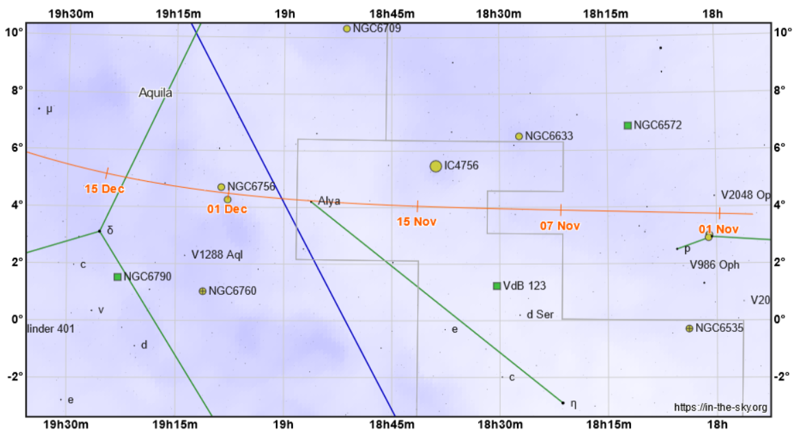 Vyhľadávacia mapka kométy C/2023 A3 (oranžová čiara s dátumami) v novembri a decembri v súhvezdiach Hadonosa, Hada a Orla. Modrá čiara znázorňuje galaktický rovník.