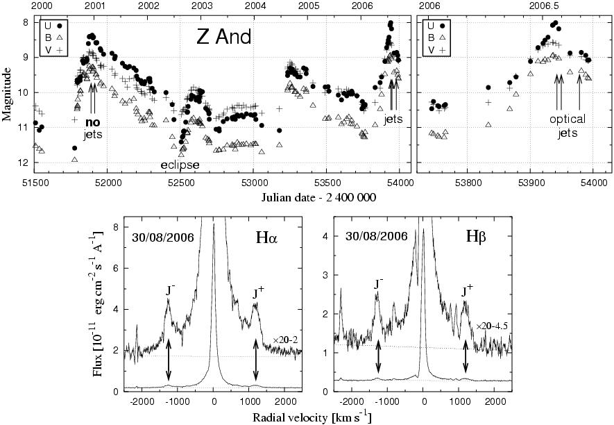 30. augusta 2006 o 19 hodine svetového času sme 1,88 m ďalekohľadom observatória David Dunlop Univerzity v Toronte získali vysokodisperzné spektrá Z And (R=11000) v spektrálnych oblastiach 643,0 - 670,0 nm a 462,0 - 491,5 nm. Vodíkové čiary H alfa a H beta vykazovali silnú centrálnu emisiu v blízkosti laboratórnej vlnovej dĺžky, obklopenú slabšími satelitnými emisiami s rýchlosťami -1260 a +1210 km/s v obidvoch čiarach. Celkové toky v týchto emisiách, zodpovedajúcim výtryskom, dosiahli 5,4 a 2,3x10-12 erg/s/cm2 v čiarach H alfa a H beta. FWHM (celková šírka v polovici maxima) fialovej emisie bola 183 km/s a červenej emisie 204 km/s. Okrem toho, bola detegovaná silná absorpčná zložka v profiloch čiar H beta a HeI 471,3 nm s rýchlosťami -150 a -90 km/s. Všetky radiálne rýchlosti sú heliocentrické. Bipolárne výtrysky v optickom spektre Z And boli zaznamenané po prvý krát.